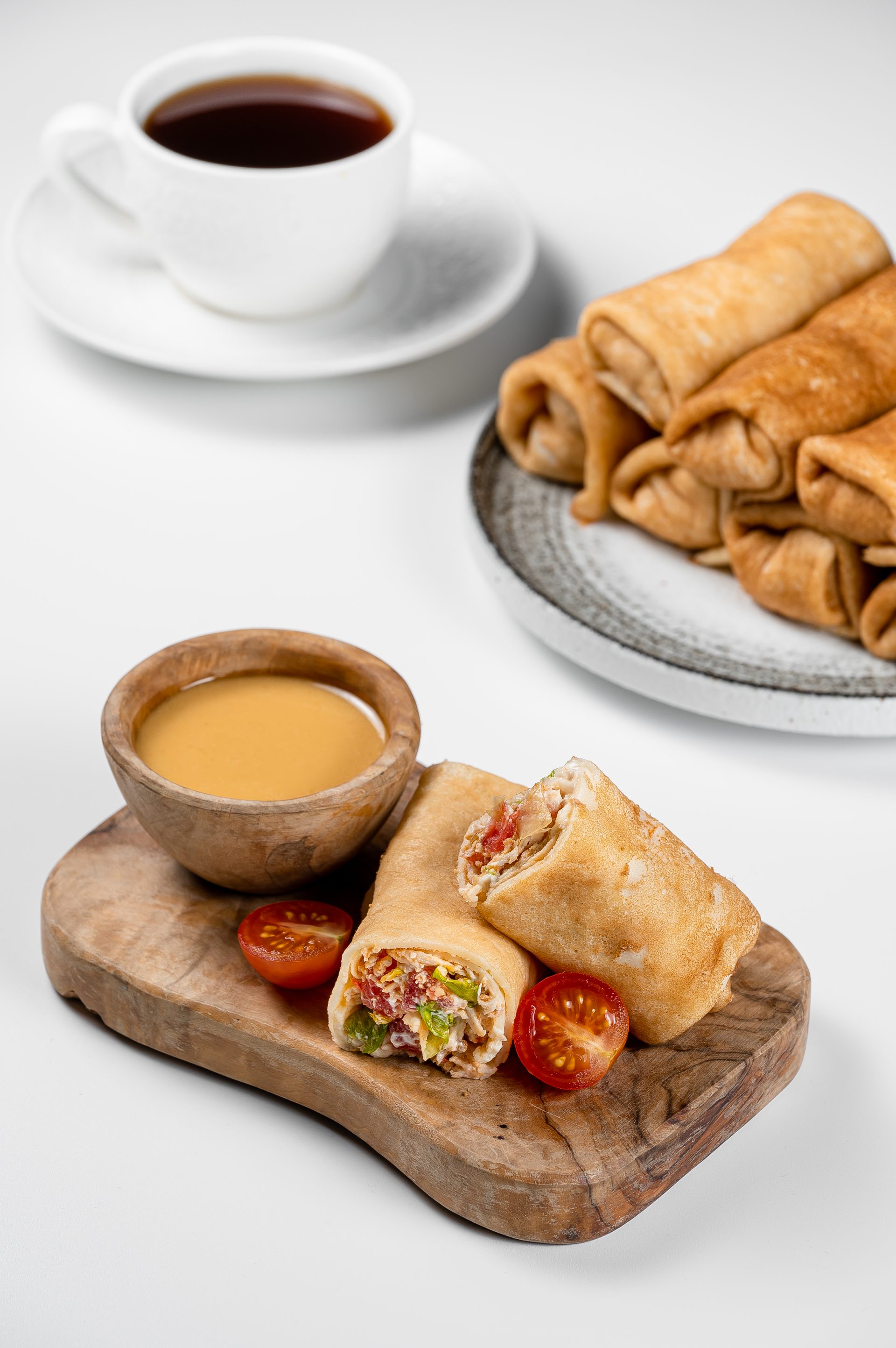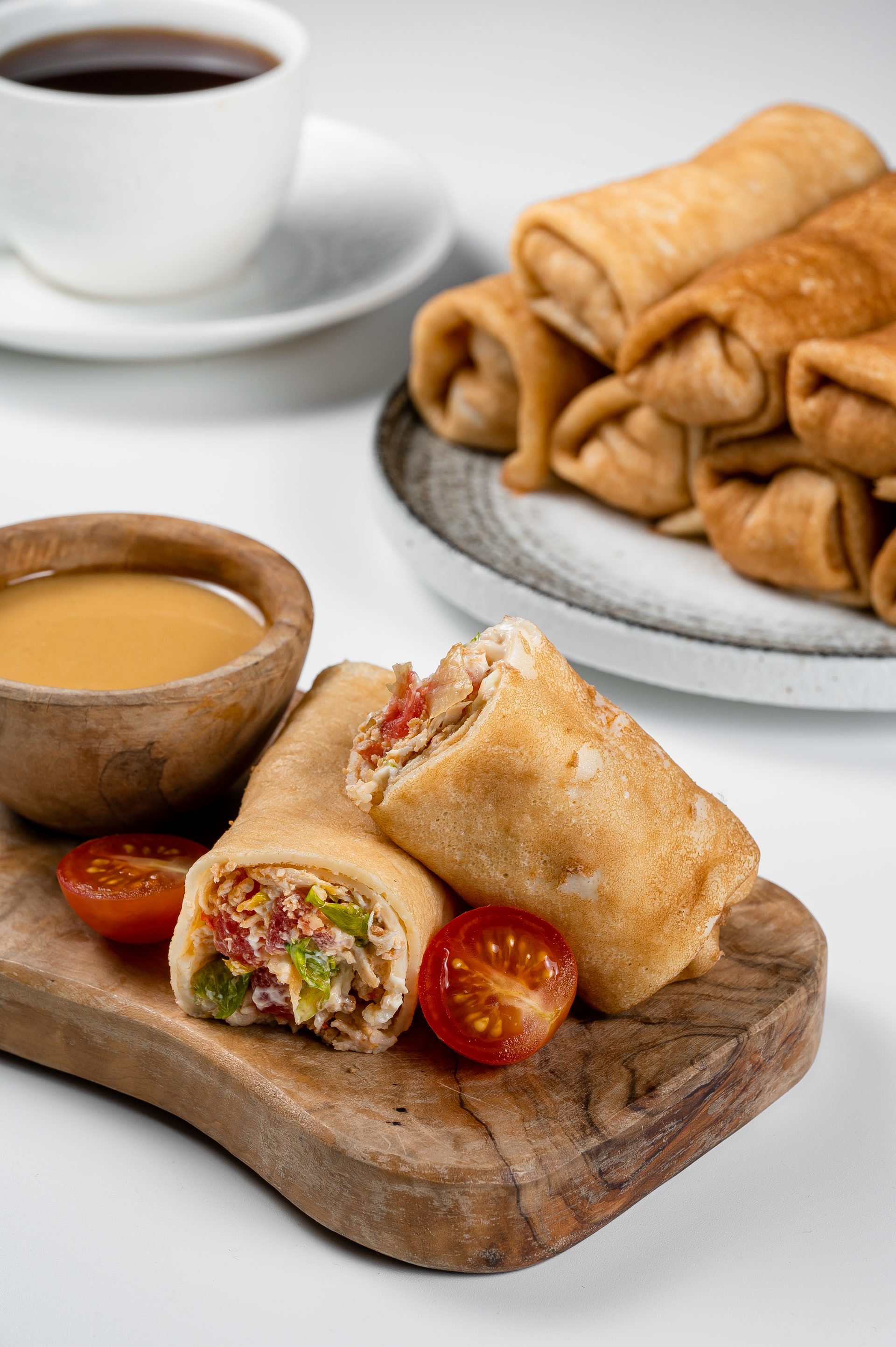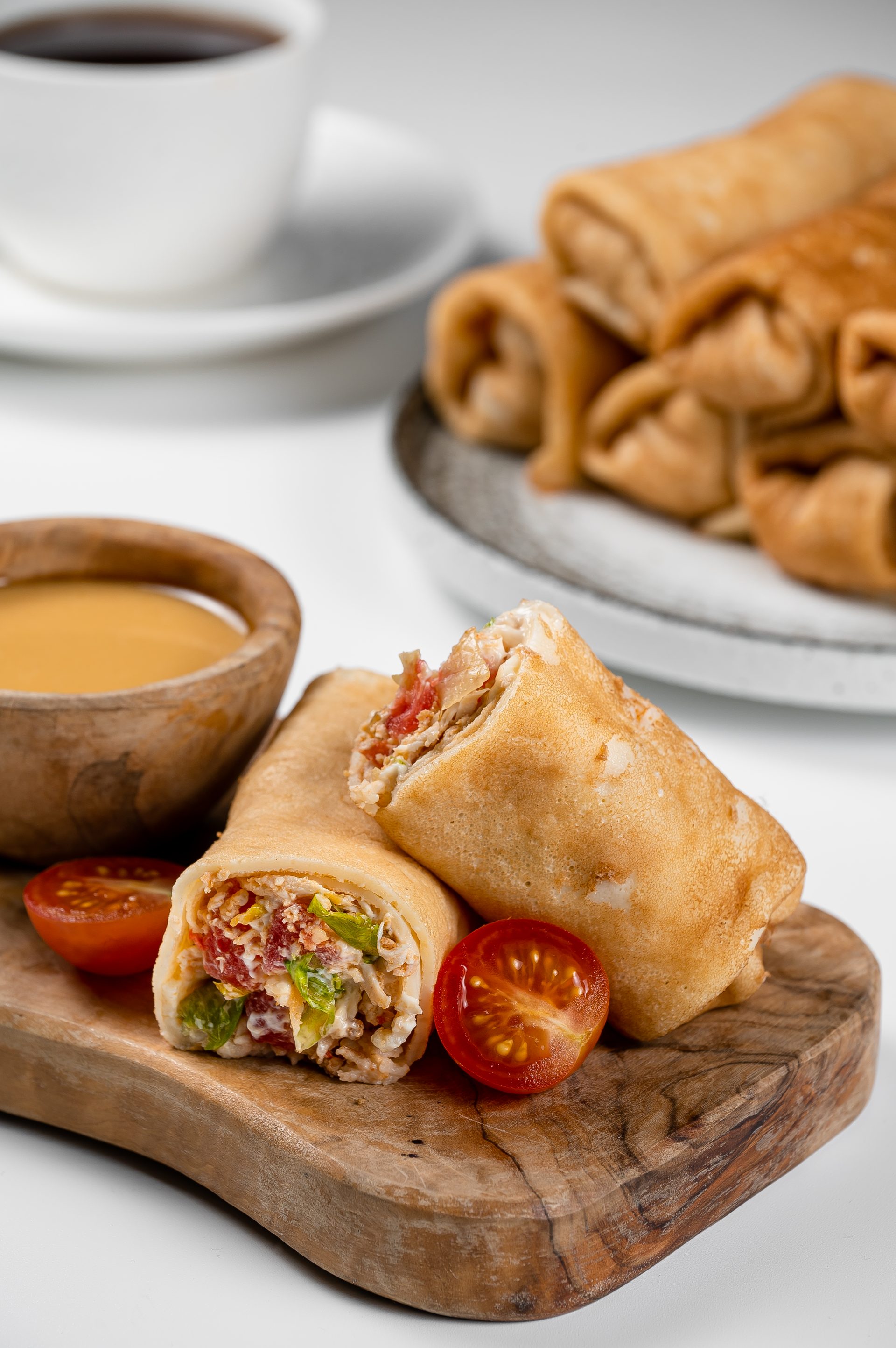 Состав: Блины, начинка (куриное филе запечёное, томаты свежие, соус Цезарь, сыр Пармезан, анчоусы в масле, сахар, чесночный сок, салат Айсберг свежий.)