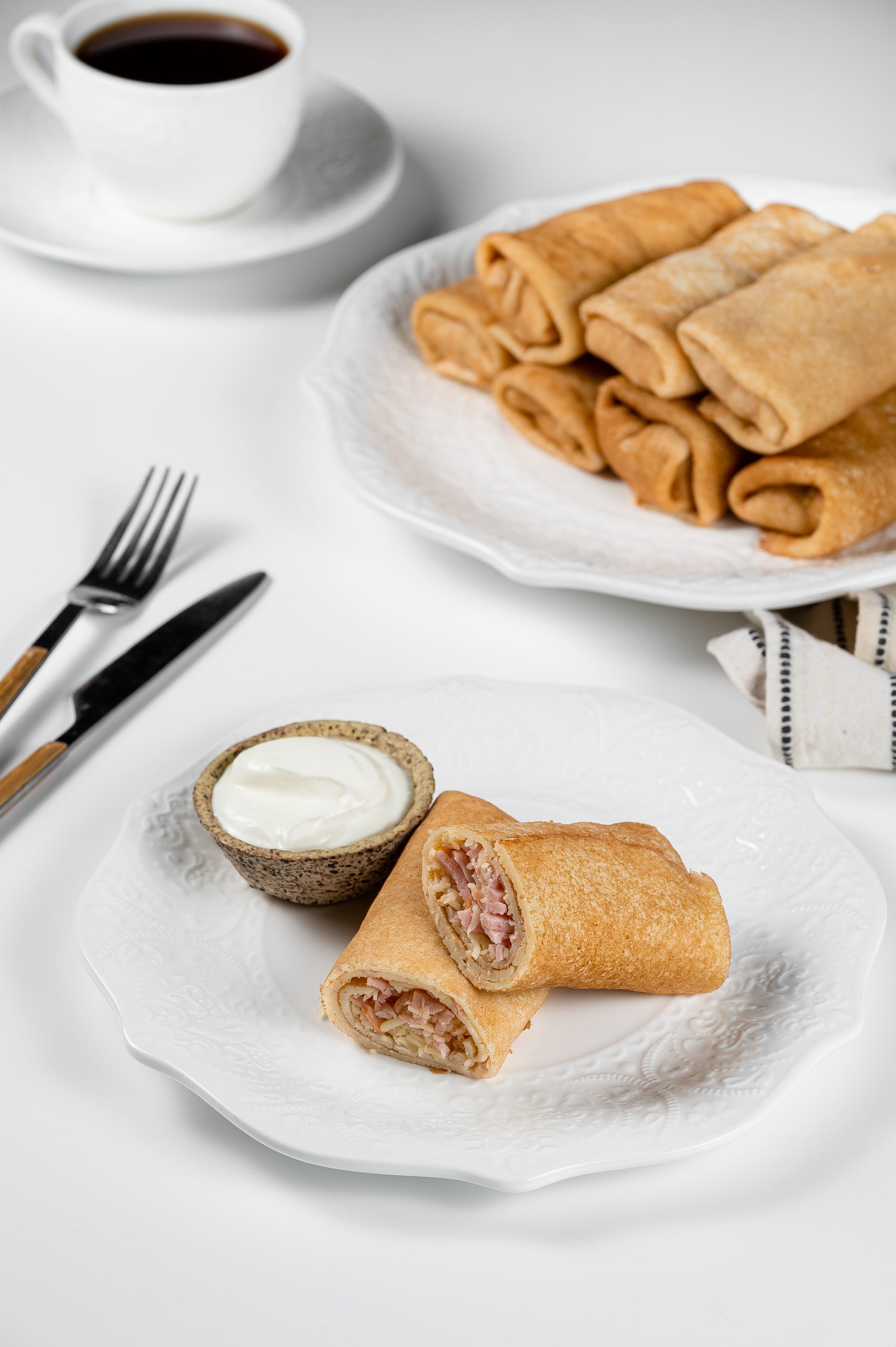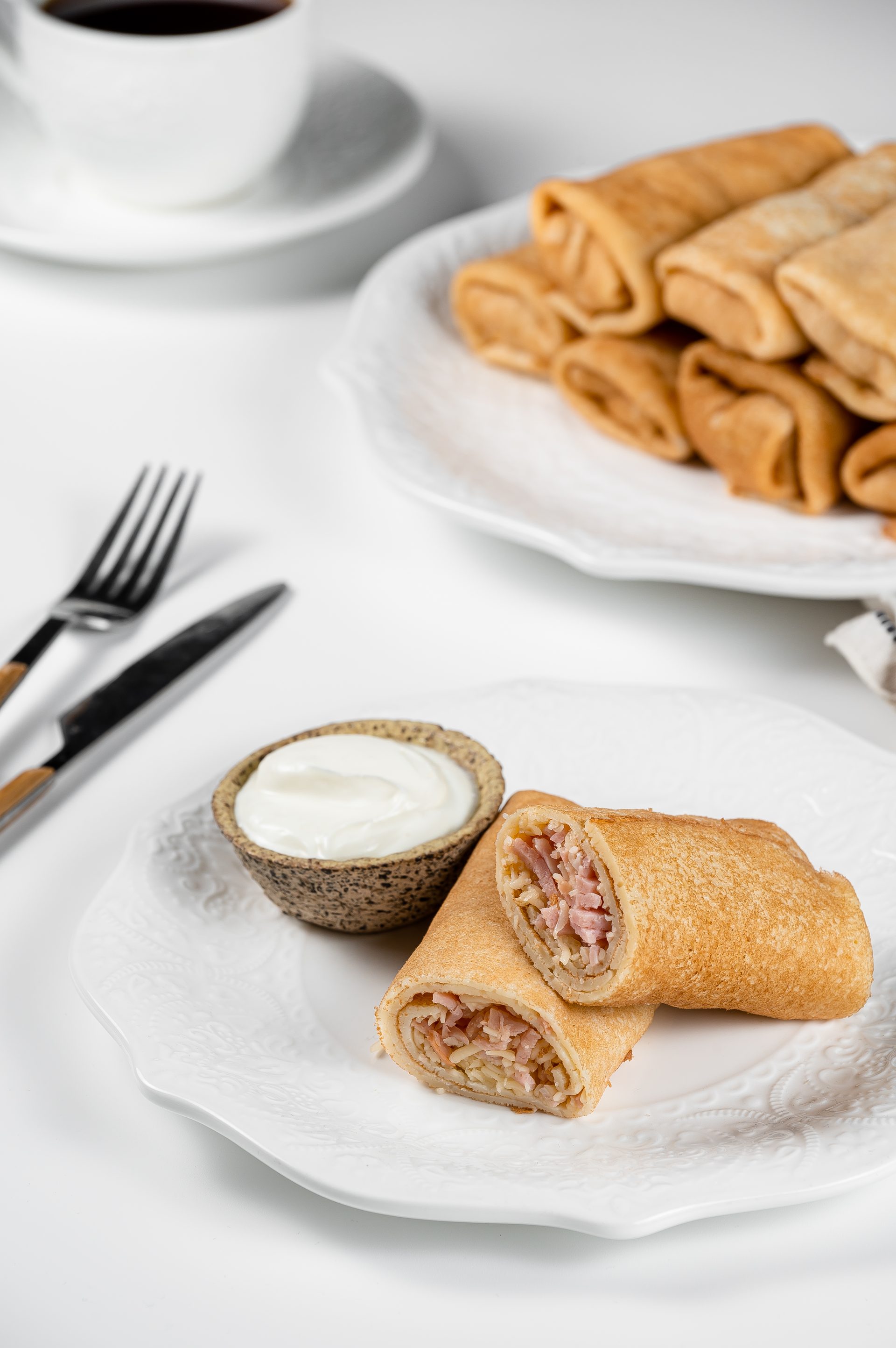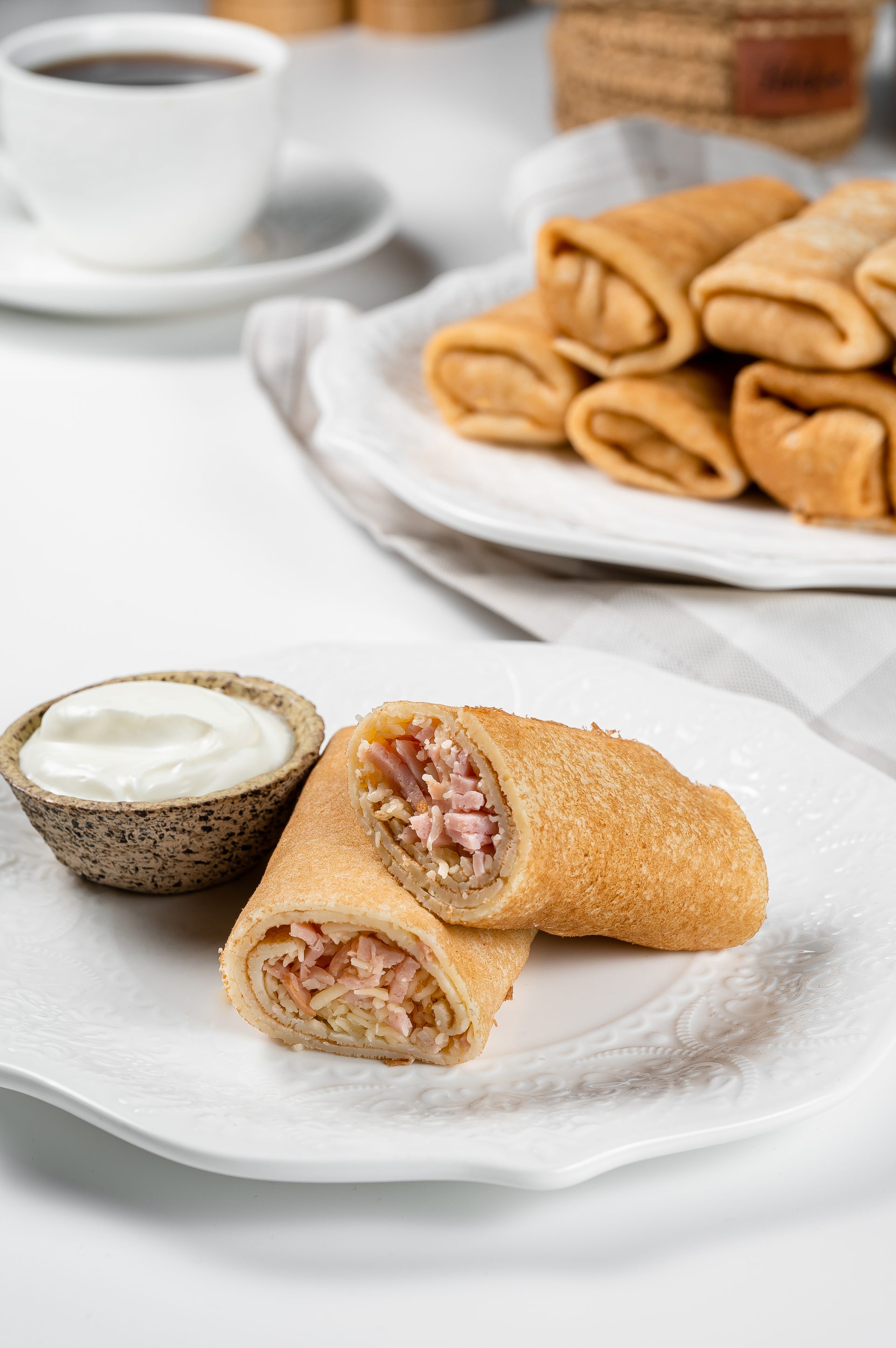 Состав: Блинчик, начинка: сыр российский, ветчина вареная (из мяса птицы), чеснок, перец черный молотый.