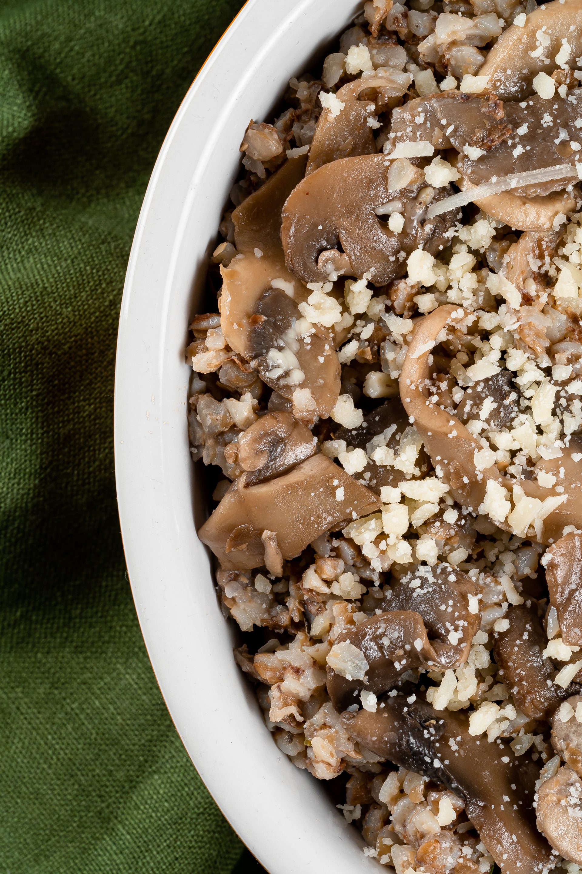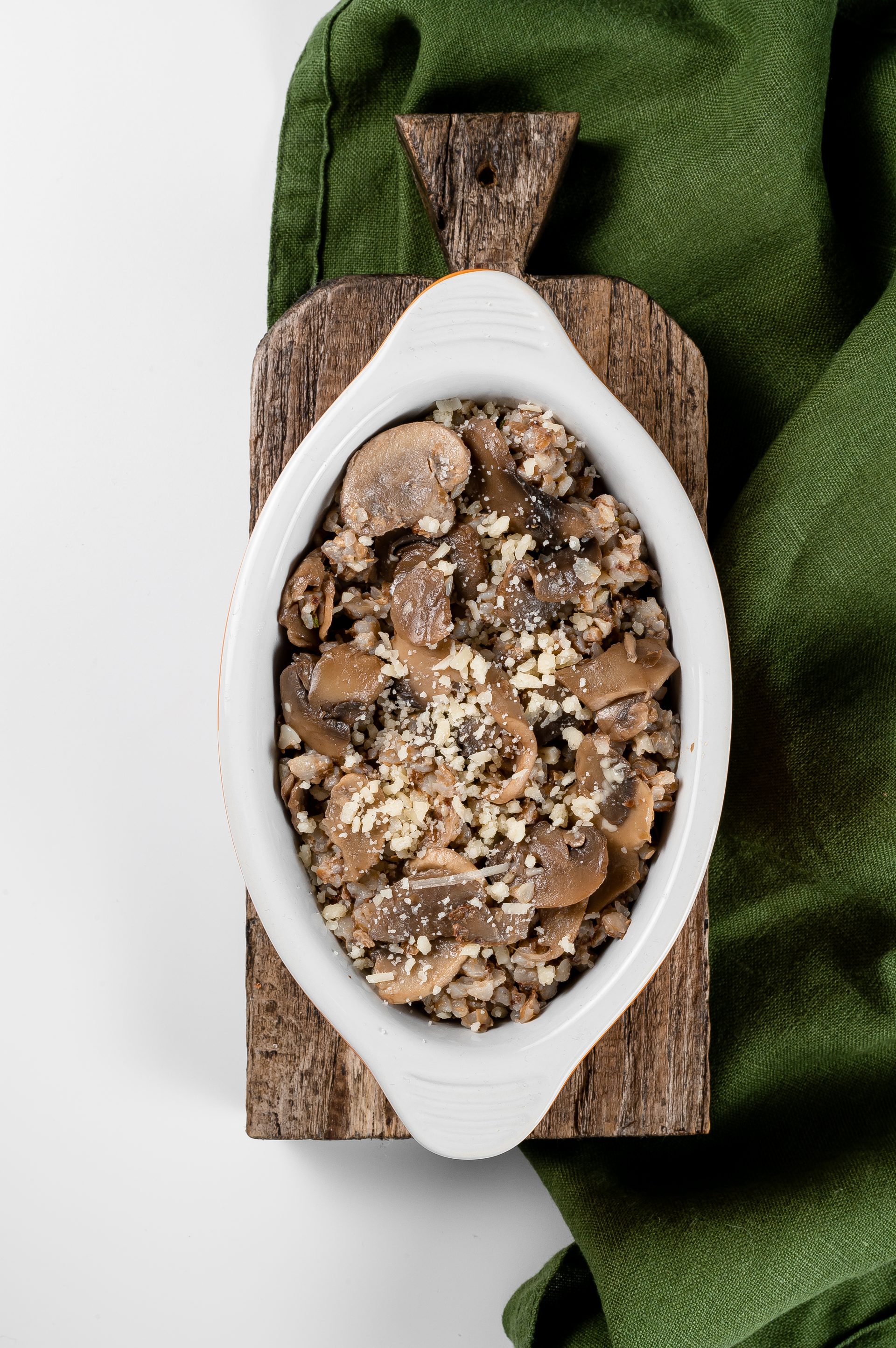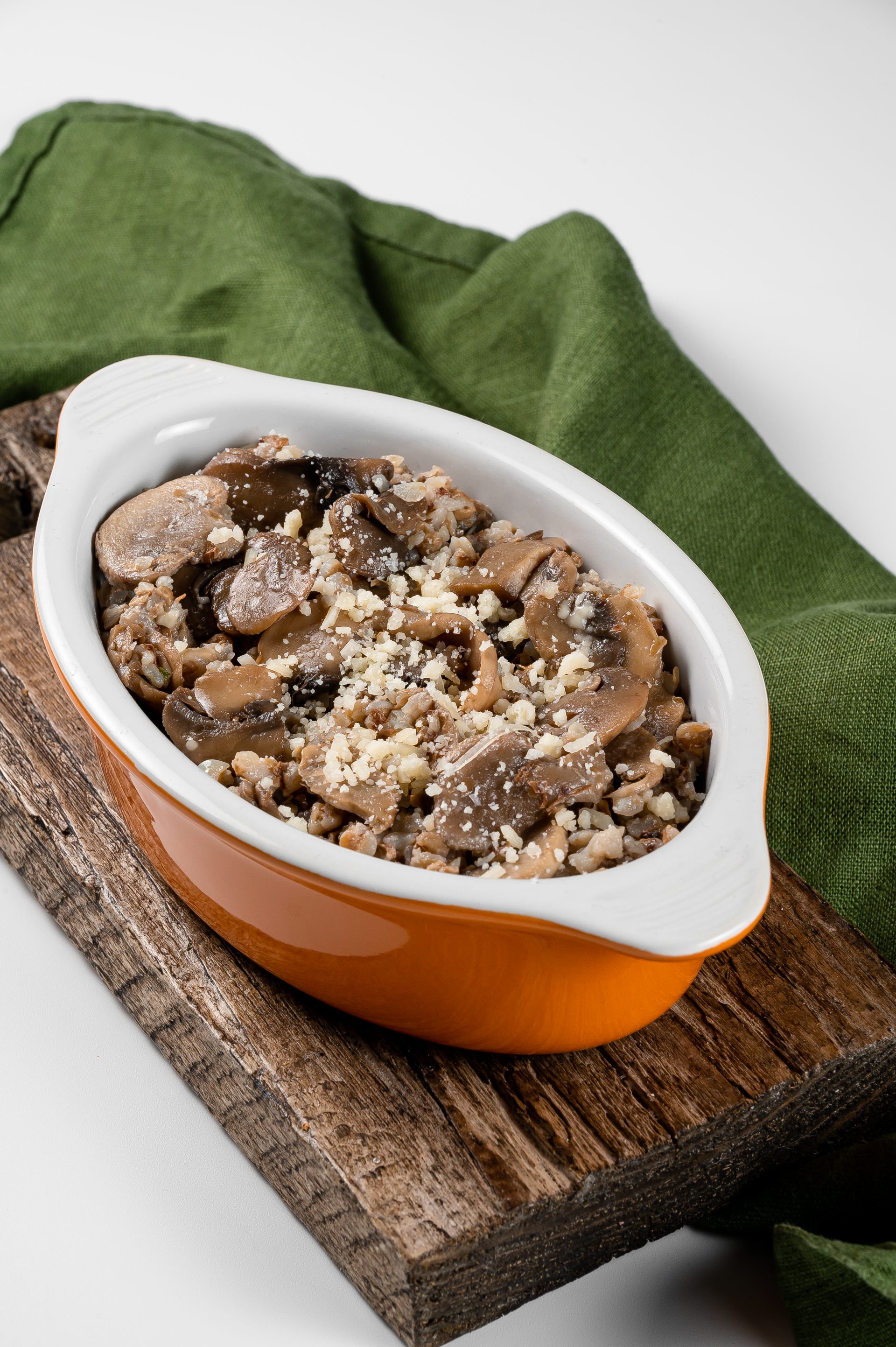 Состав: Крупа гречневая, шампиньоны, сливки, лук репчатый, масло подсолнечное, сыр Пармезан, масло сливочное, чеснок, соль пищевая, петрушка, перец черный молотый