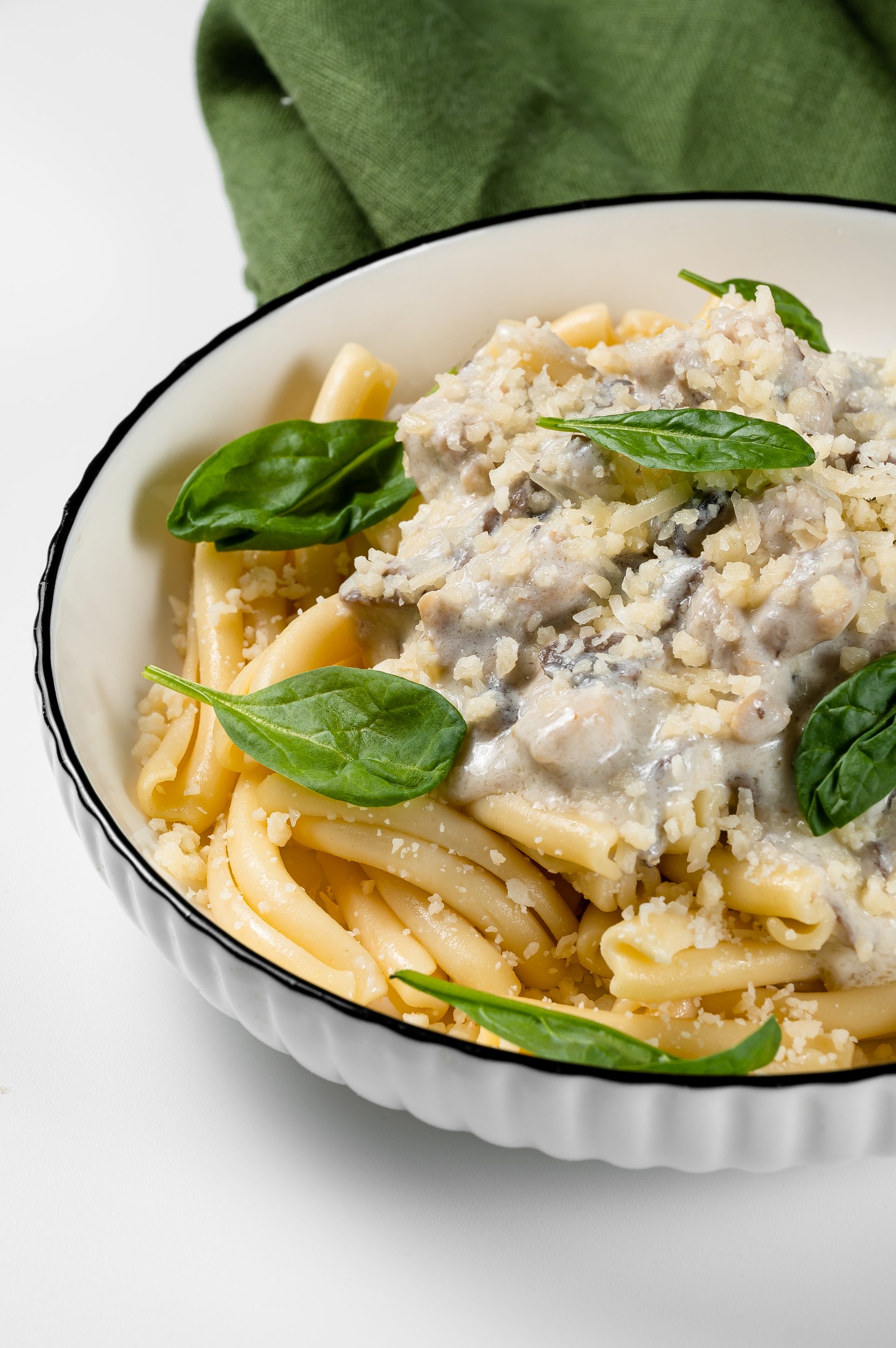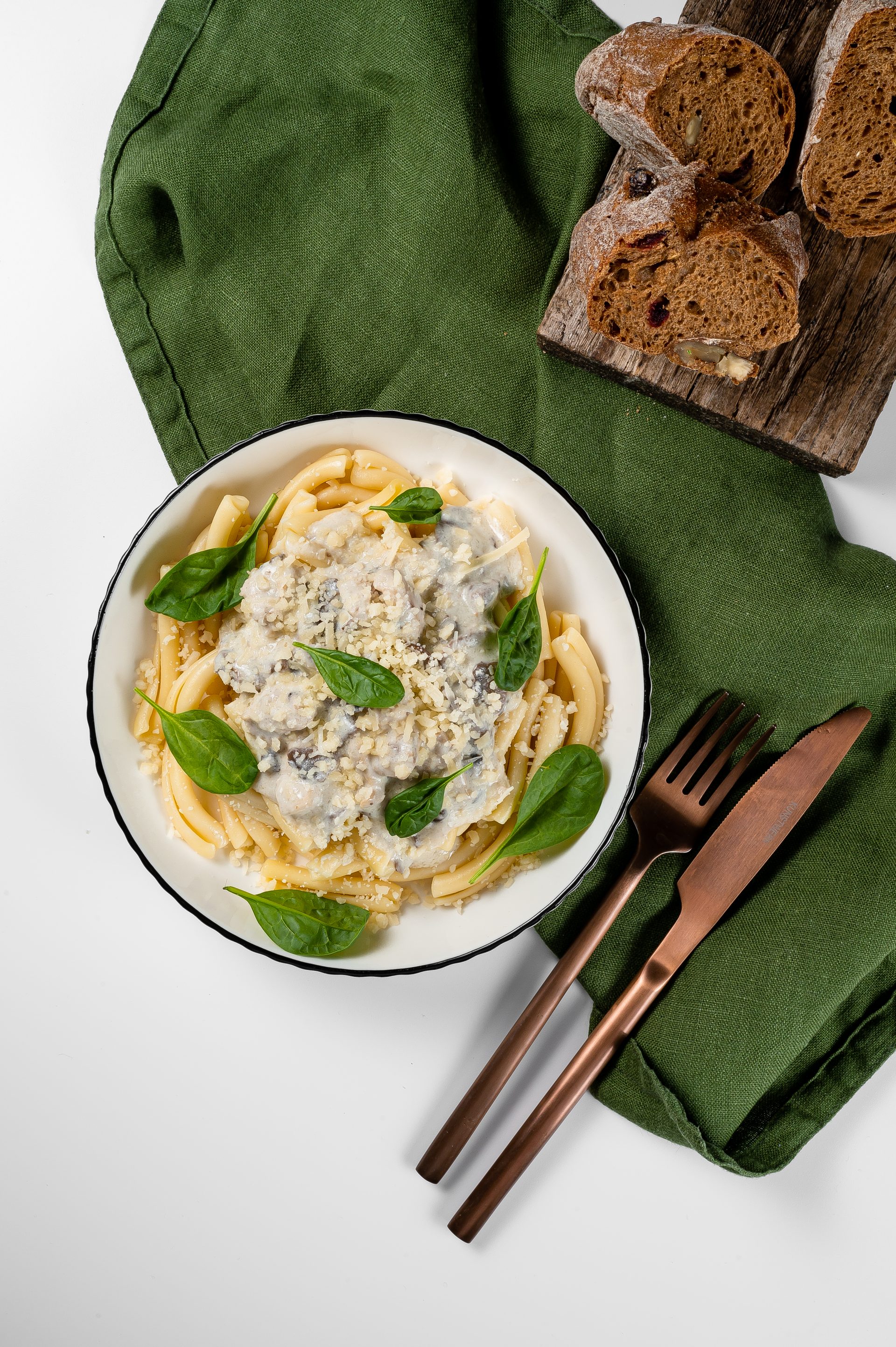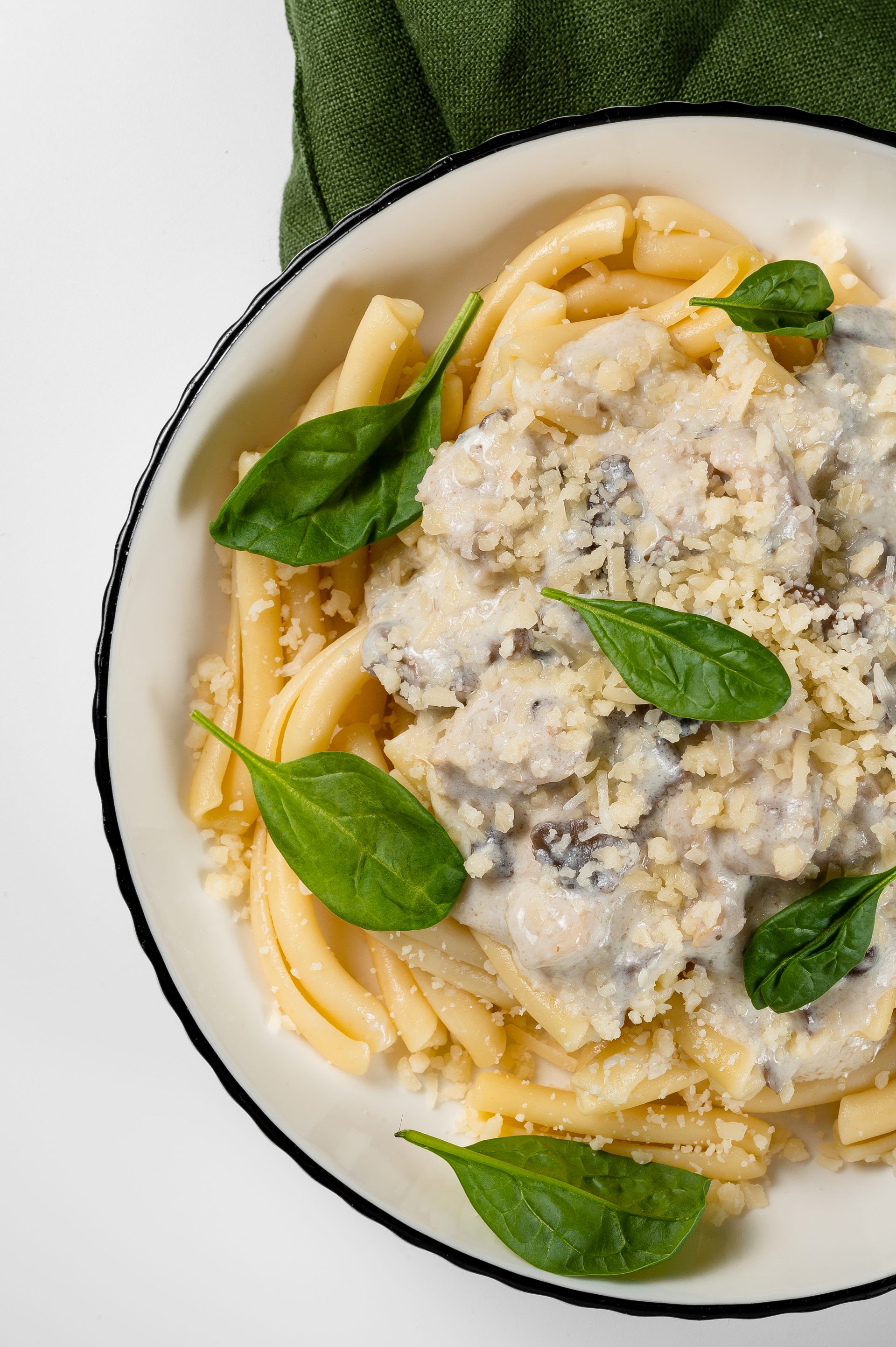 СОСТАВ: изделия макаронные отварные (вода питьевая, изделия макаронные (мука из твёрдых сортов пшеницы, вода питьевая), соль пищевая, масло подсолнечное рафинированное дезодорированное), шампиньоны свежие, вода питьевая, окорочок куриный бескостный без кожи, сливки питьевые ультрапастеризованные м.д.ж. 10% (сливки нормализованные), масло сливочное м.д.ж. 82,5% (пастеризо- ванные сливки), масло подсолнечное рафинированное дезодорированное, крахмал кукурузный, сыр Пармезан м.д.ж. в сухом веществе 40% (молоко нормализованное пастеризованное, соль пищевая, закваска культур молочнокислых микроорганизмов, молокосвёртывающий ферментный препарат микробного происхождения, уплотнитель хлорид кальция), соль пищевая, сахар, грибы белые сушеные гранулированные, масло оливковое нерафинированное со вкусом белого трюфеля (масло оливковое нерафинированное, натуральный ароматизатор, сушеный белый трюфель), перец черный молотый. Будьте внимательны! Возможно попадание косточки!