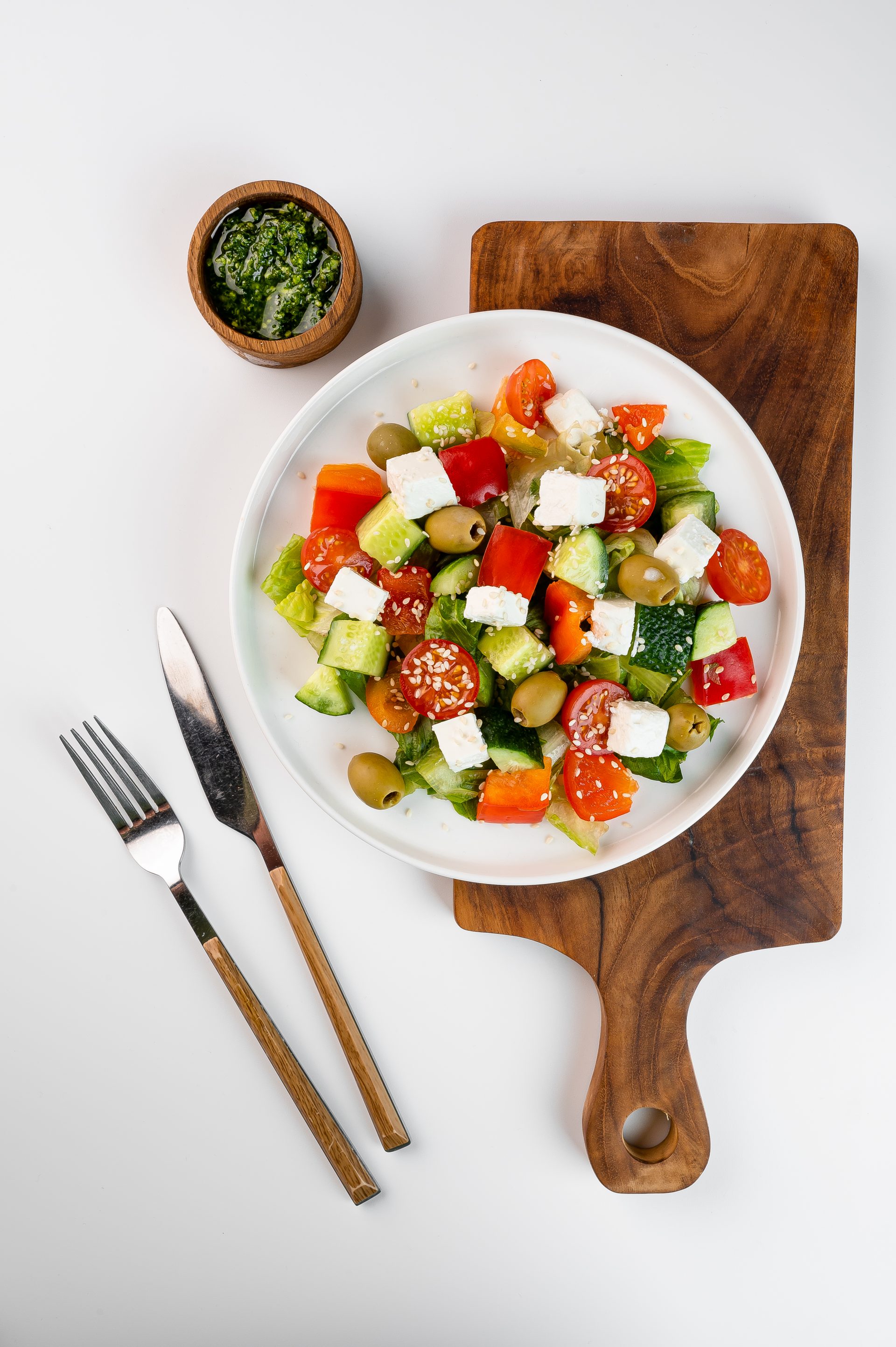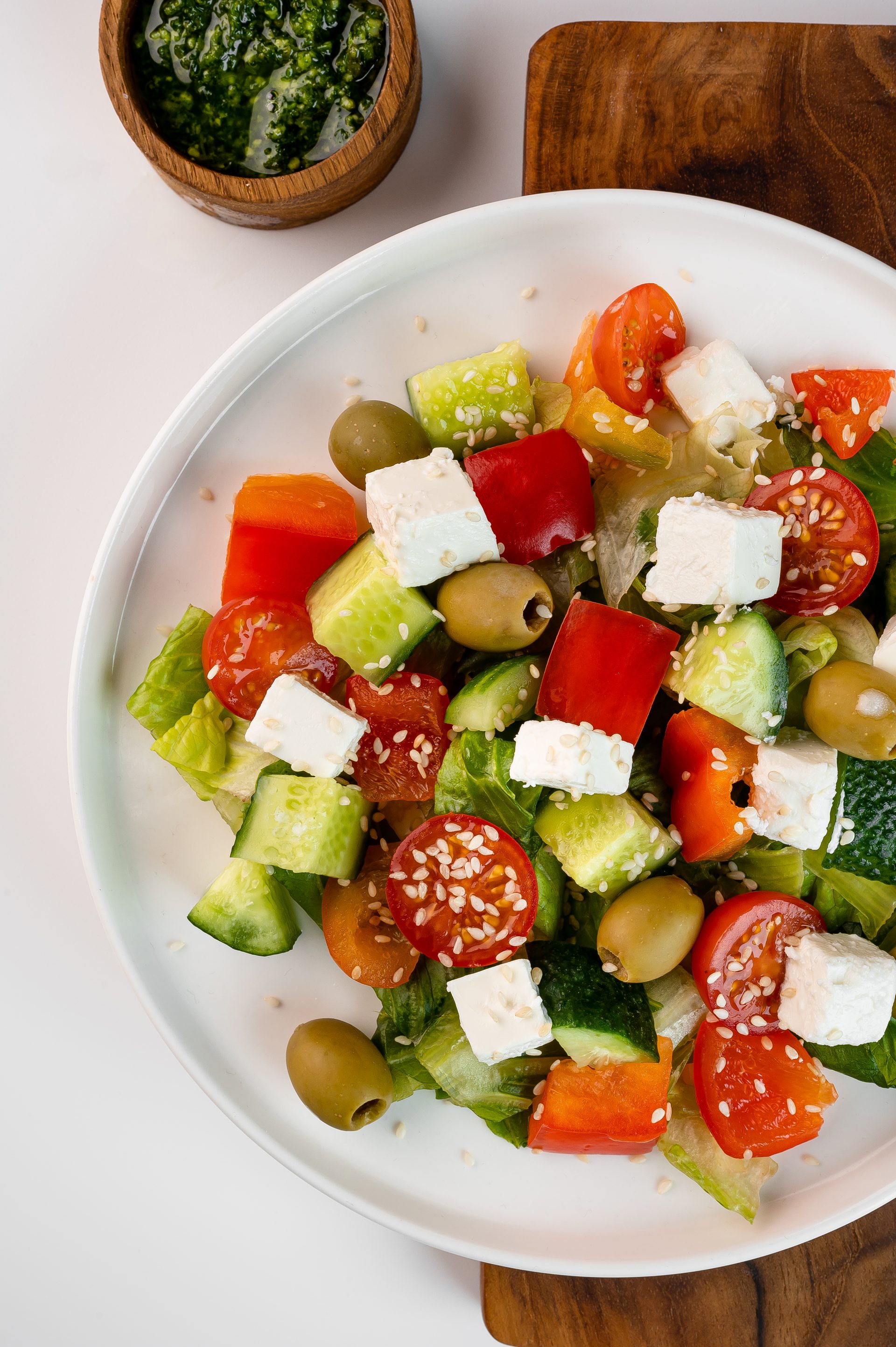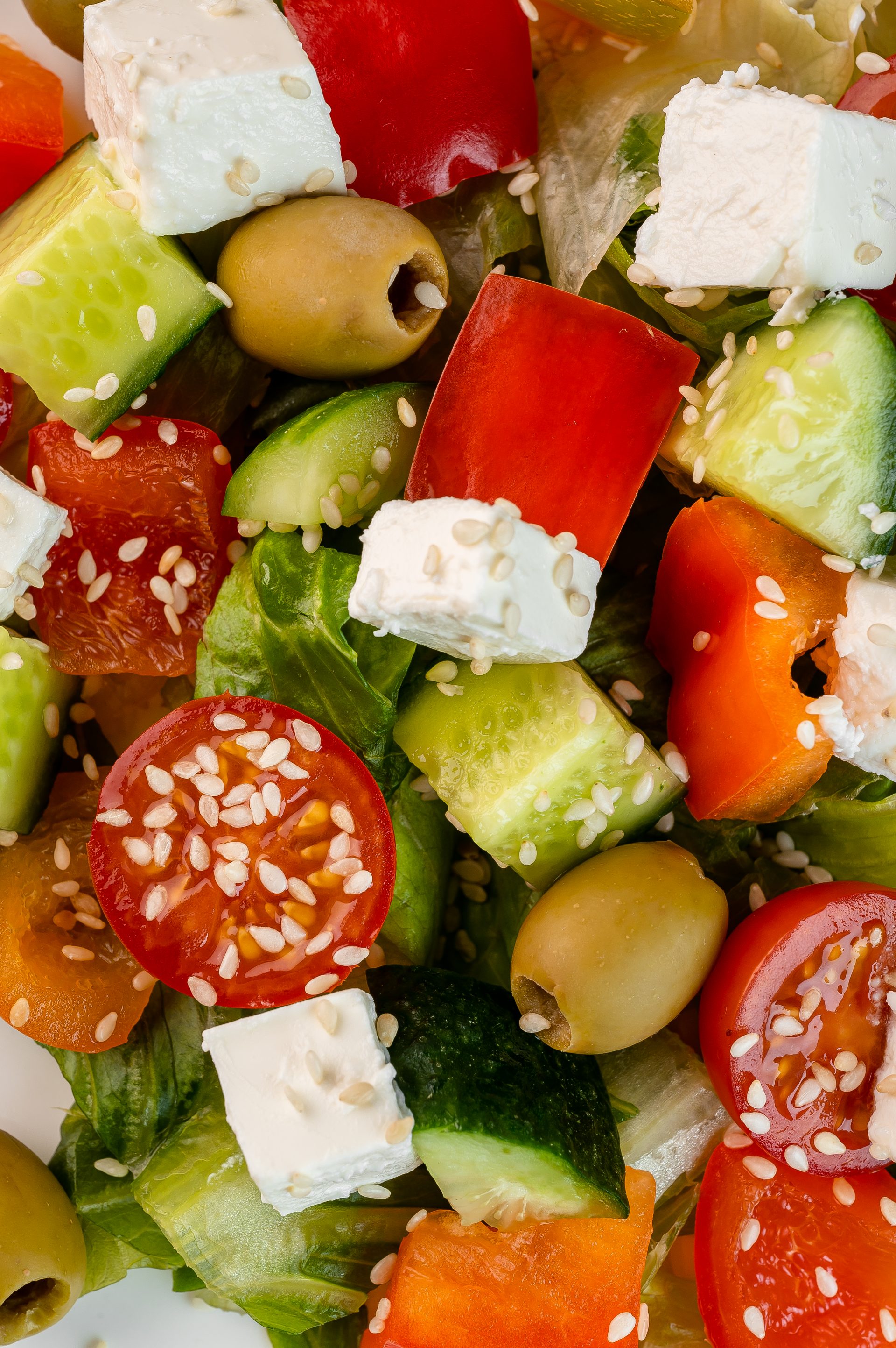 Состав: Томаты Черри, салат Айсберг, перец сладкий, огурцы, сыр брынза, салат Романо, масло подсолнечное, оливки, масло оливковое рафинированное, базилик, сыр Пармезан, петрушка, арахис, укроп, кунжут, соль пищевая, чеснок.