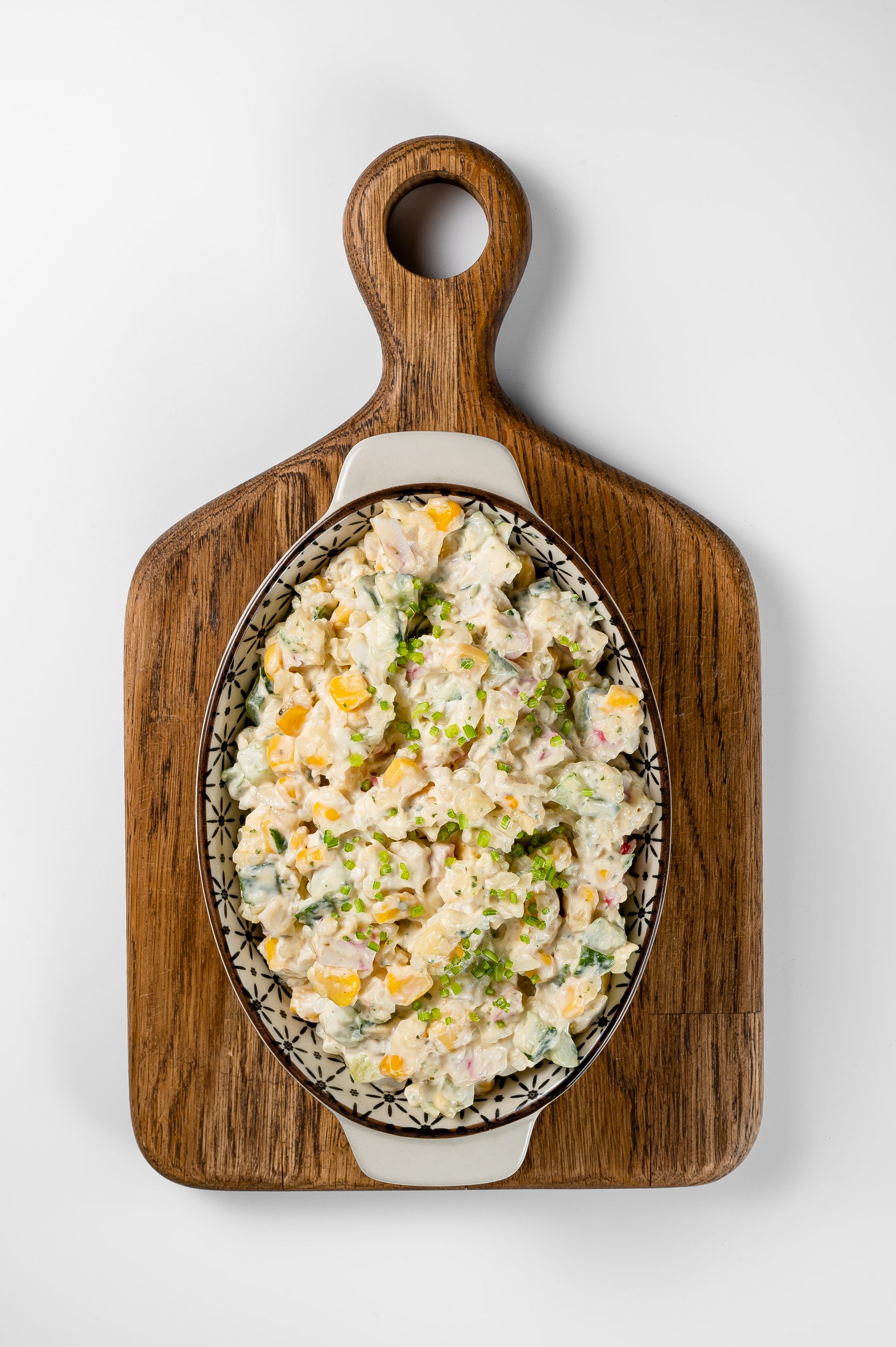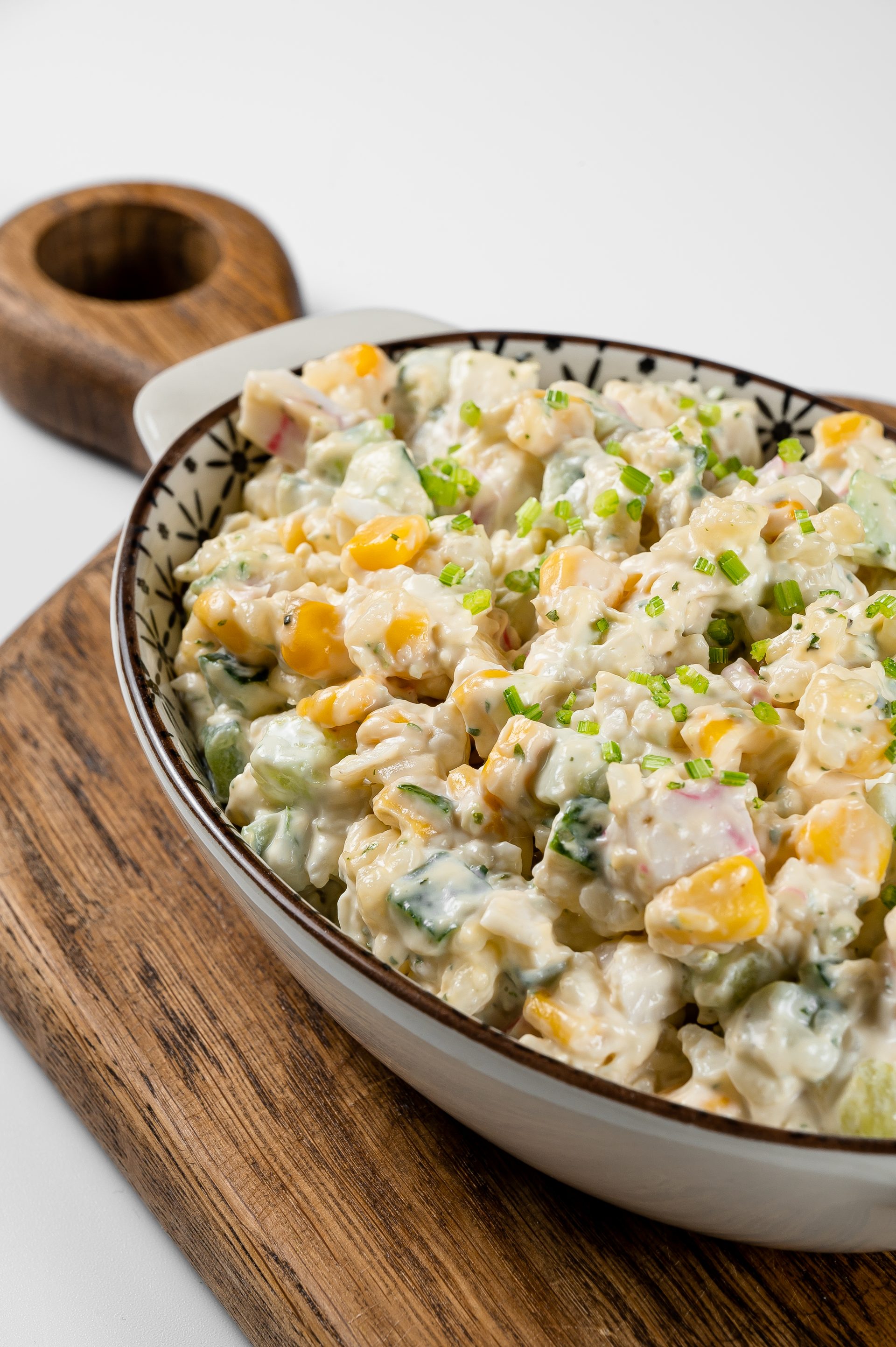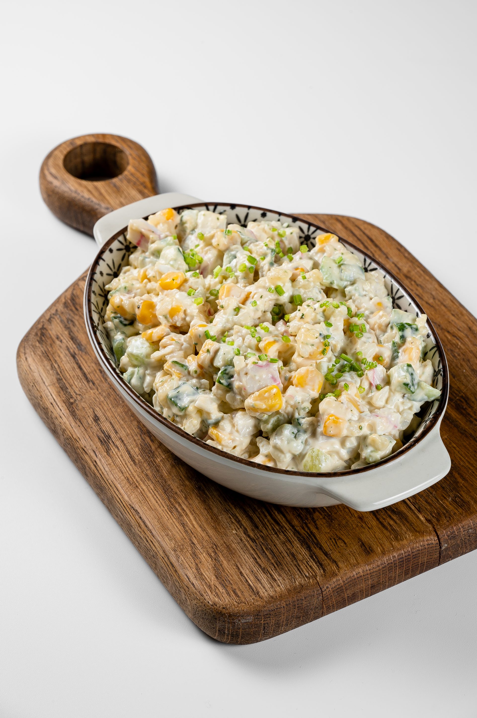 Состав: яйцо вареное, огурцы маринованные, крабовые палочки, кукуруза, сыр, майонез.